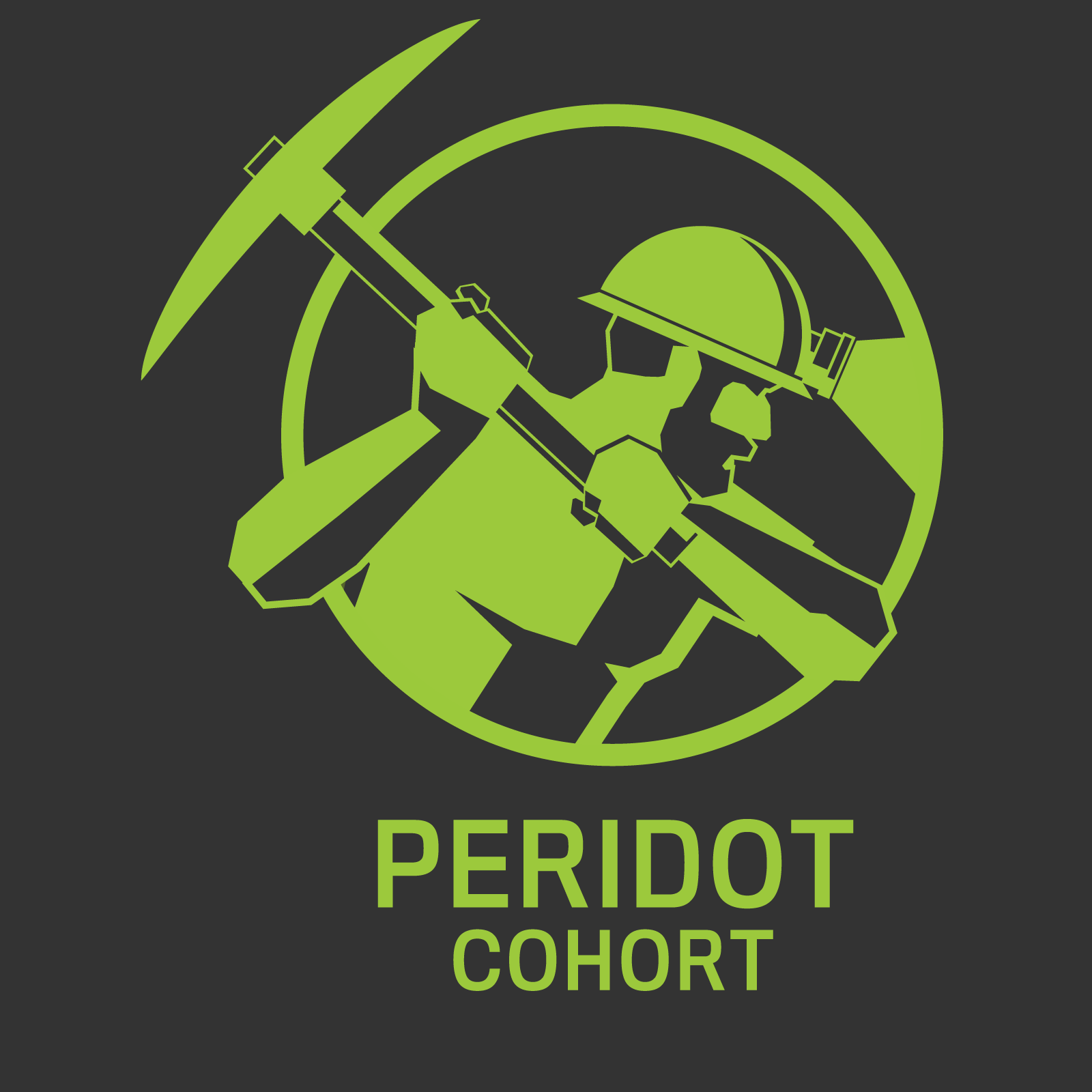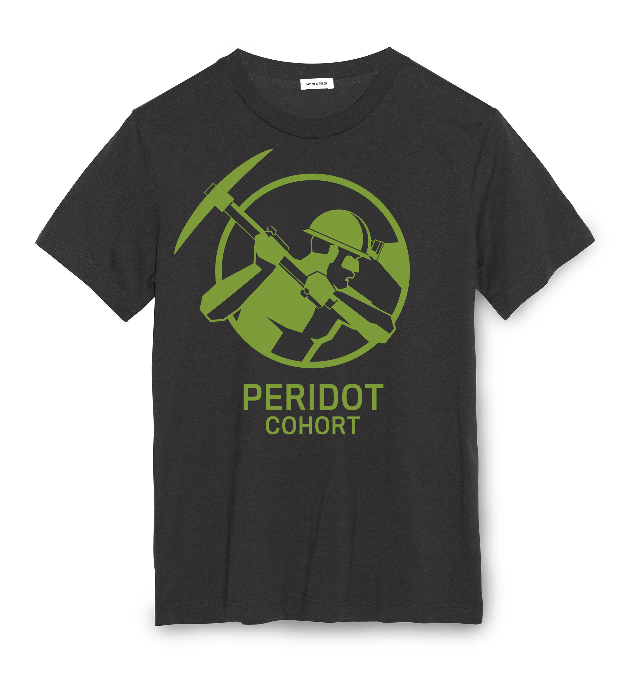 Each DESIGNATION cohort was (alphabetically) named after a gemstone. Representing the school’s 16th cohort, the peridot gemstone is a consistent translucent yellow-green in color. Rather than represent the stone itself, I illustrated a miner representing both the labor to extract the stone and the labor of the cohort to complete the rigorous bootcamp coursework.