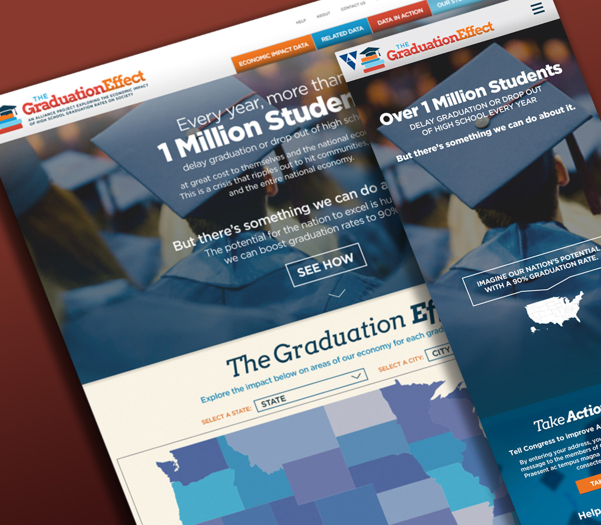 The Alliance for Excellent Education presented the challenge of redesigning their Graduation Effect project, a data-rich web application which examines the current crisis in high school graduation rates and explores the potential positive economic impact of a 90% graduation rate. Utilizing the visual metaphor of a classroom chalkboard and a roll up US map, the site user can toggle between the map as navigation device and the economic data on the chalkboard below.