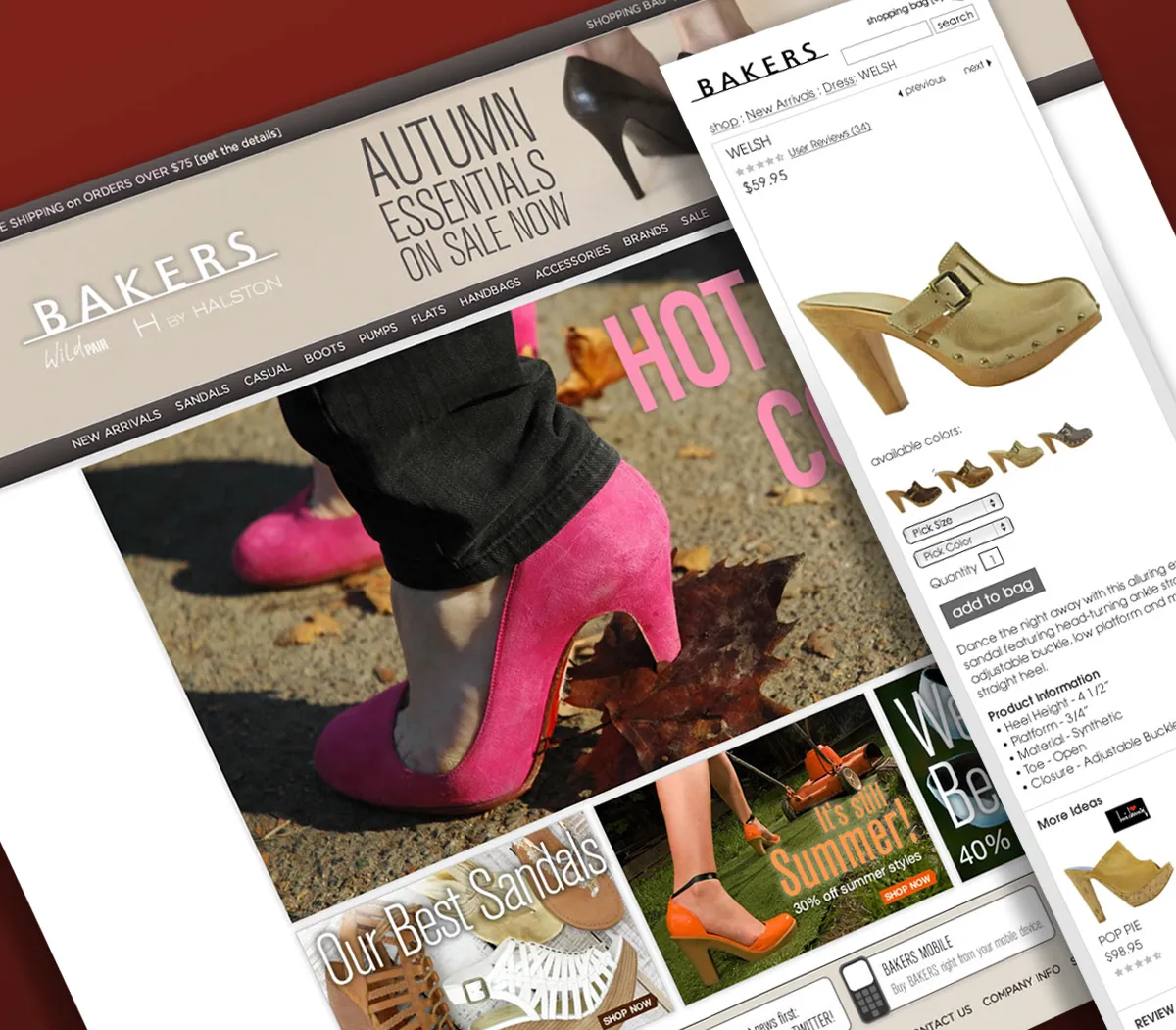 A longstanding ecommerce partnership between Virid and Bakers has yielded numerous successes, including continuous annual sales growth, industry recognition (Bakers mobile has been touted as an ideal mobile shopping experience), and a site framework flexible enough to allow for redesign without changes to site architecture. Leveraging seasonal campaign imagery and textures throughout, this proposed site design maintains tight integration with print campaigns. Bakers’ loyal customer base can shop large-scale imagery and clear, concise information matrices on product listing and detail pages.
